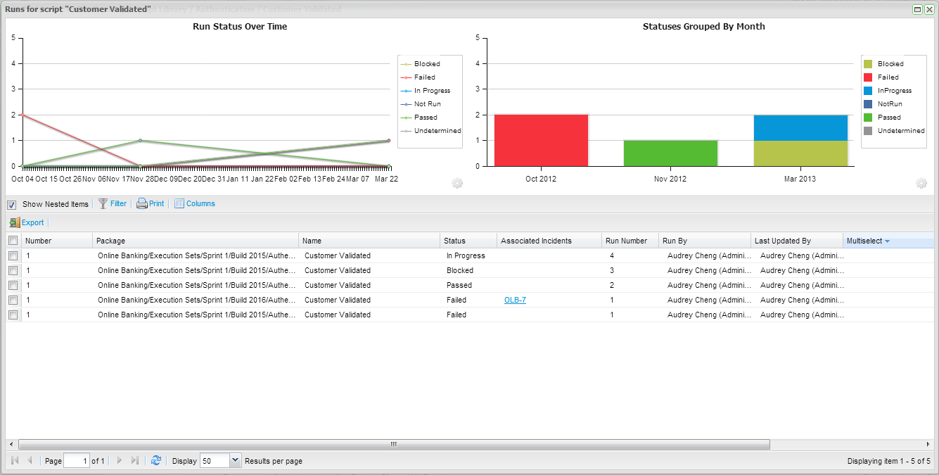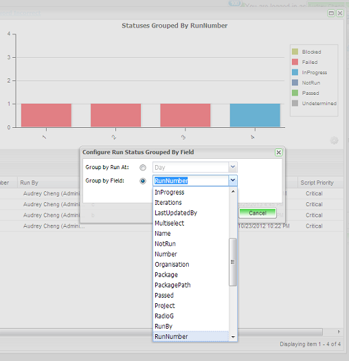 Two charting widgets are provided as standard, the Status Over Time widget and the Statuses Group By Widget. The type of widgets to display are not configurable. From the Run History screen for script assignment. The Status Grouped By widget is configurable and you change chose a date or field parameter to group.