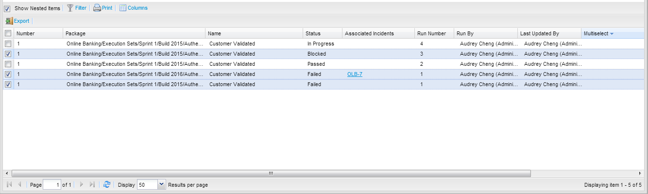 The details displayed on the Run History grid are configurable. You can click Columns button on the toolbar to select the inbuilt fields or the custom field to display in the grid. You can filter the runs in view by using Search or TQL. Click on the Filter button on the toolbar to access the Search functions.