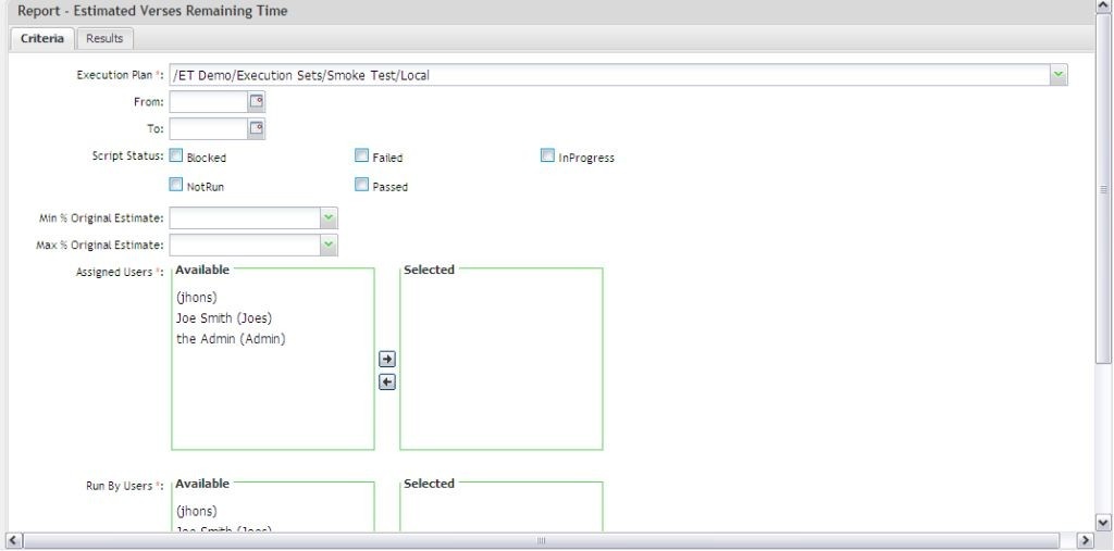 This shows the total estimated for the selected execution scripts verses the actual and the remaining time available. Note that once all the estimated time has been used no remaining time will be displayed as shown above.