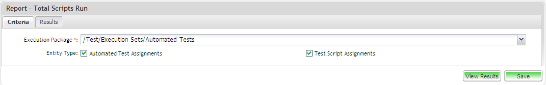 You can define the package to report on and the test type(s) you would like to view the Run status of. You can select Automated Test Assignments or Manual Test Assignments (Test Script Assignments).