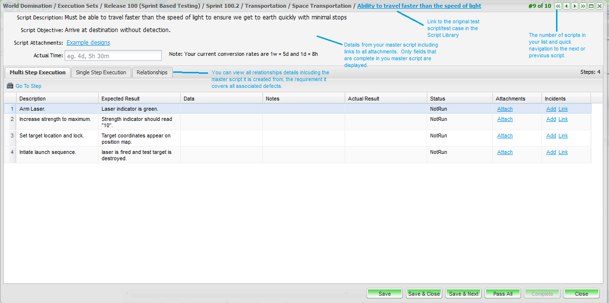 3. The Relationships tab shows all associations with this script run including the original master script in the script library, the requirement that the script covers and any associated incidents raised during testing.