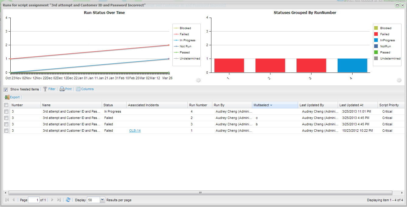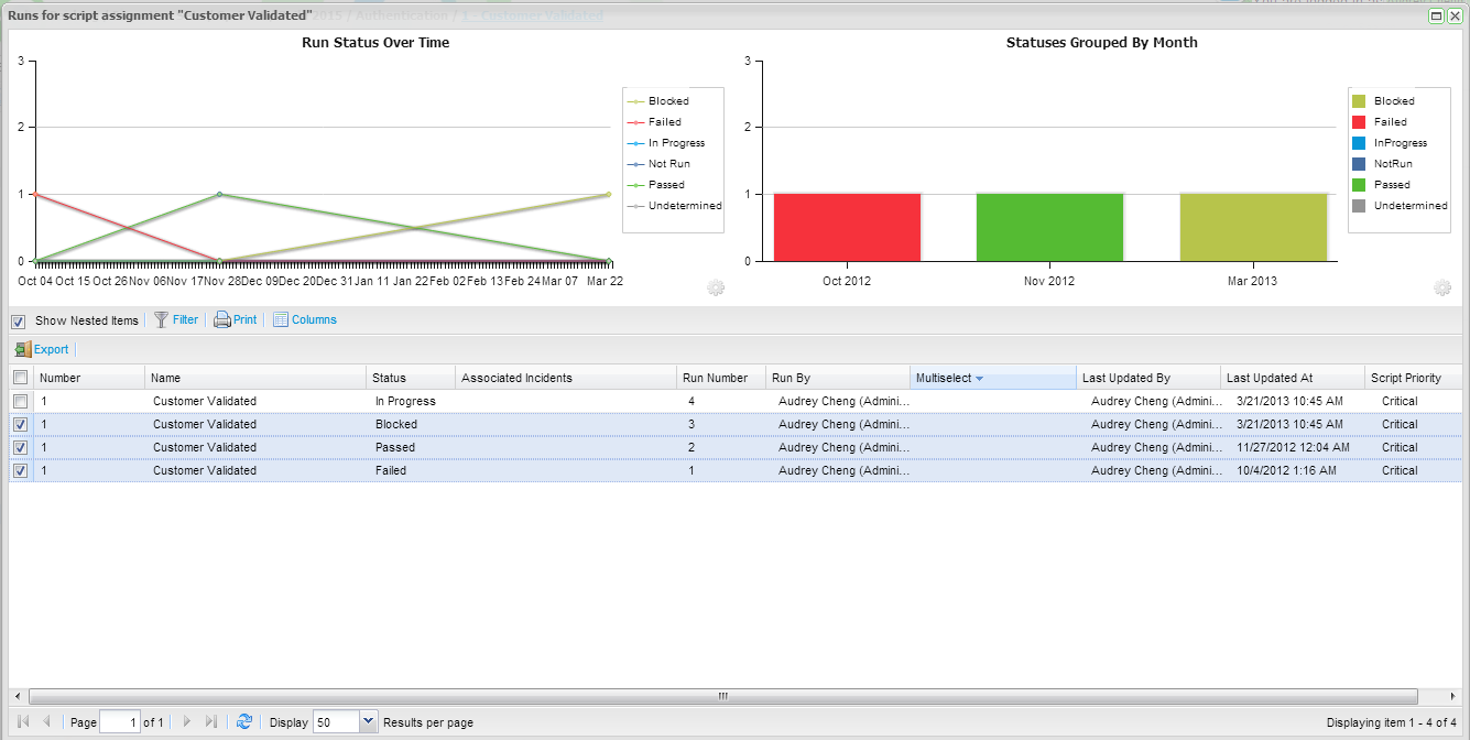 Two charting widgets are provided as standard, the Status Over Time widget and the Statuses Group By Widget. The type of widgets to display are not configurable. From the Run History screen for script assignment. The Status Grouped By widget is configurable and you change chose a date or field parameter to group.