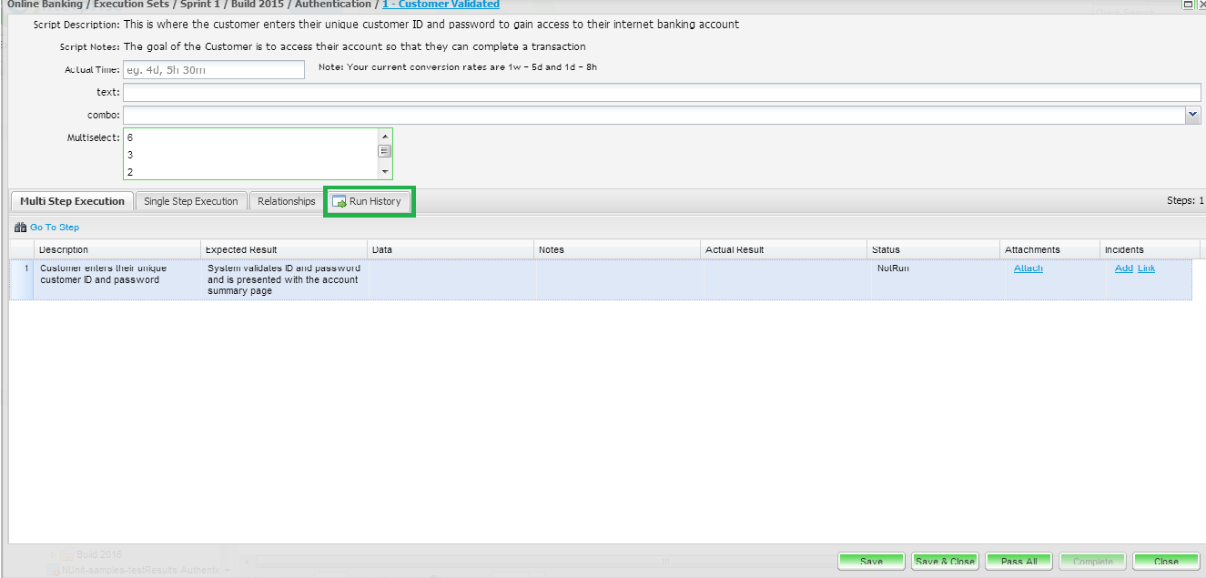 When you view the script assignment in the execution set, the latest run results are presented. You can view the full run history of the script, by clicking on the Run History tab.