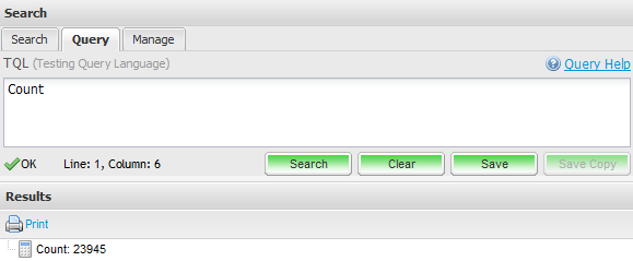 The simplest aggregate query you can run is to count all entities within Enterprise Tester: