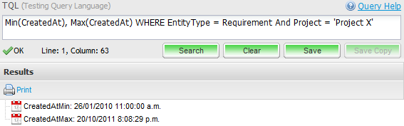 For example, to find the oldest and newest requirement in a project you can use the following query: