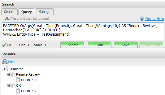 FACETED OrArgs(GreaterThan(Errors,0), GreaterThan(Warnings,10)) AS "Require Review",