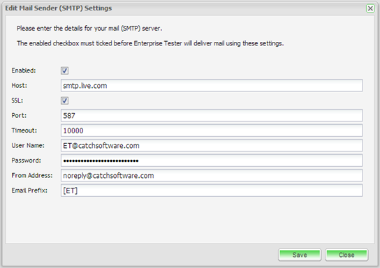 Enterprise Tester supports the ability to configure a mail server to support event notification. To configure a mail server, from the Admin tab, expand Configuration and double click on Mail Server.