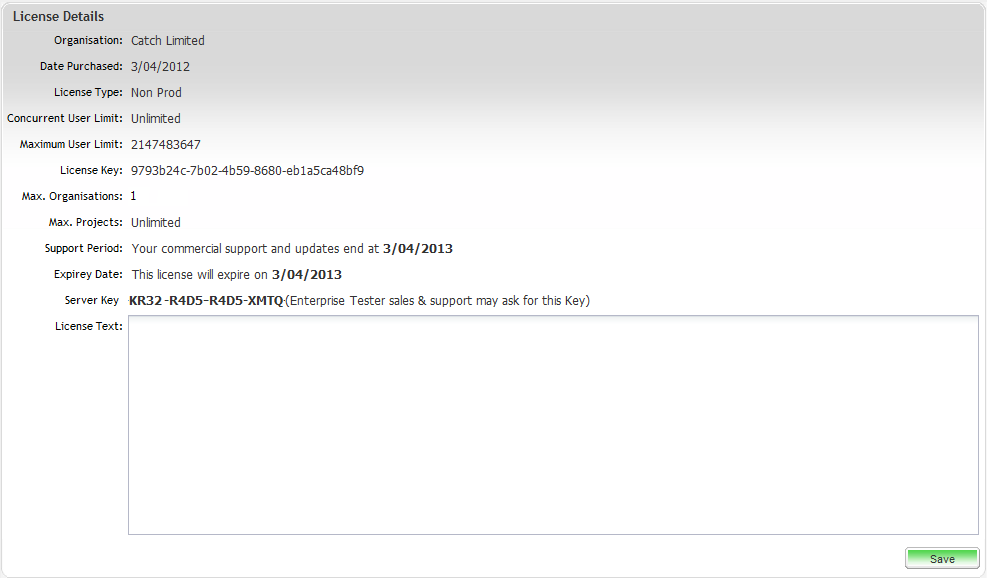 Here you will be able to view your license parameters including the maximum number of concurrent user, maximum number of named users and the start and expiry date of your license.