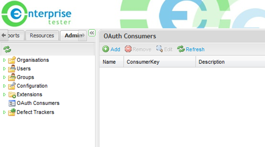 An example of the JIRA Consumer Information screen is displayed below: - Once you have added and saved your Consumer information in Enterprise Tester, it will now accept connections from the JIRA / Confluence server. All connections can be managed from this screen.
