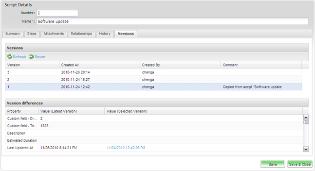Version history is provided on all elements within your Enterprise Tester repository. Like Baselines, the version history does not require a Version Control Repository and is a built in capability of Enterprise Tester. Each time you add a new element such as a requirement or test script an initial version is created. As you modify an element a further incremental version is automatically created. When viewing your requirement or test script, by clicking on the Versions tab you will be able to view all versions and compare the elements of a selected version to the current version.