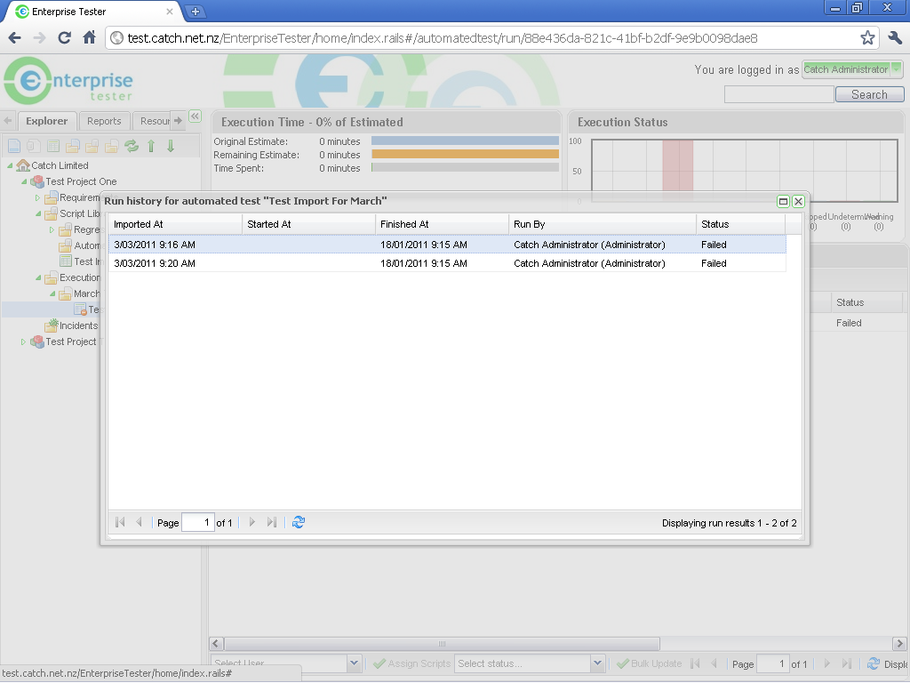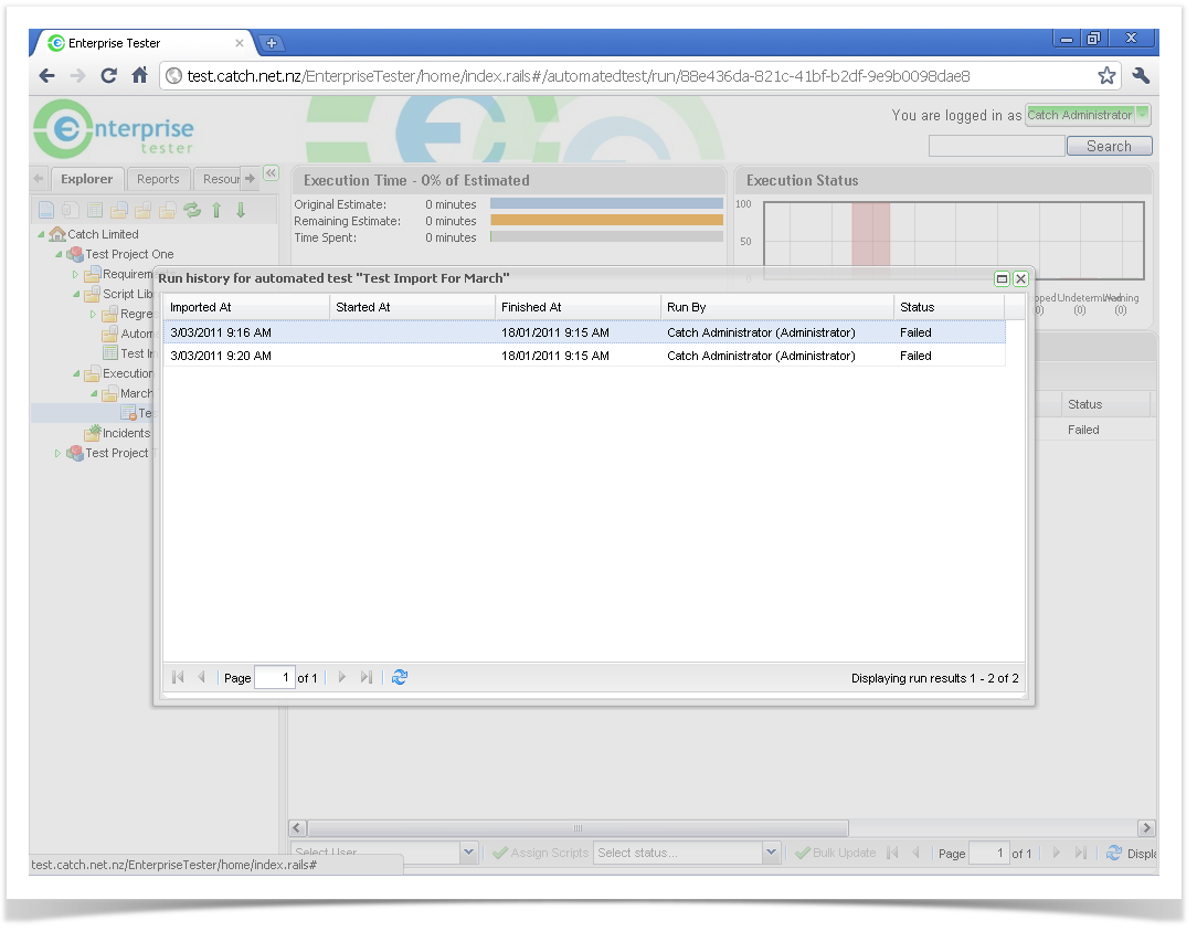 - The Run History screen is displayed for all previous automated test imports - click once on a row to view the relevant test run.
