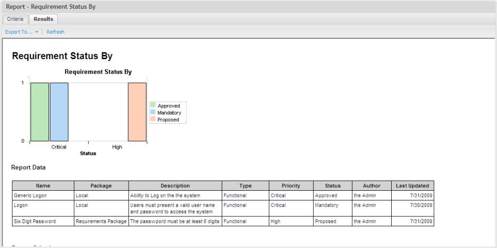 Shows a graph of requirements by status and the supporting data in a table.