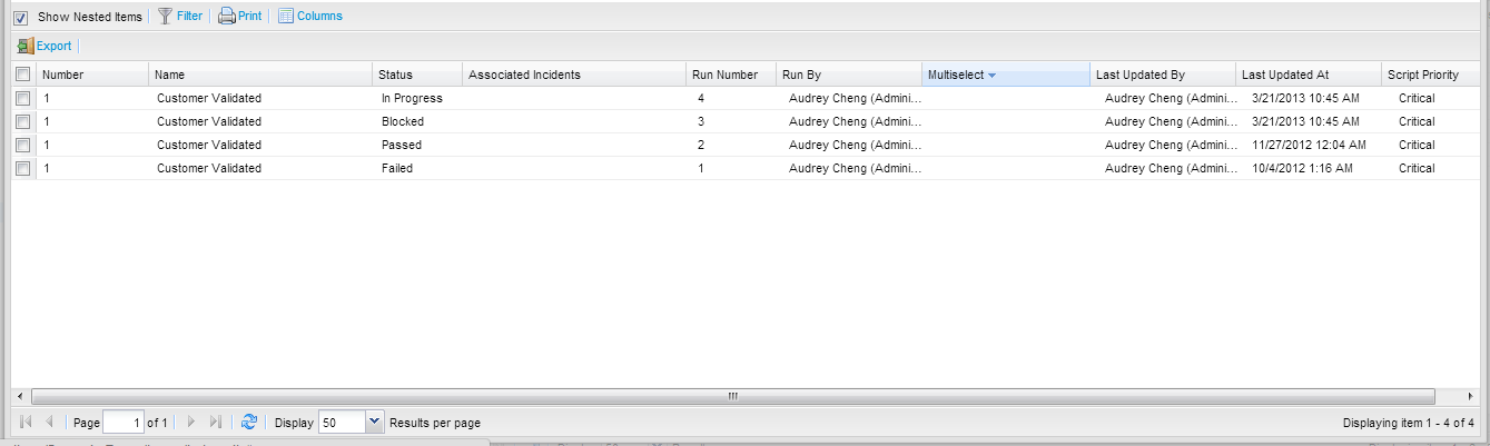 The details displayed on the Run History grid are configurable. You can click Columns button on the toolbar to select the inbuilt fields or the custom field to display in the grid. You can filter the runs in view by using Search or TQL. Click on the Filter button on the toolbar to access the Search functions.