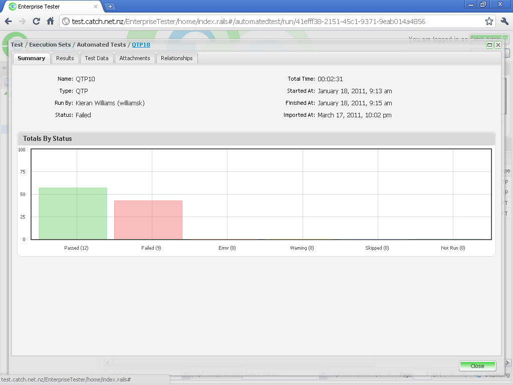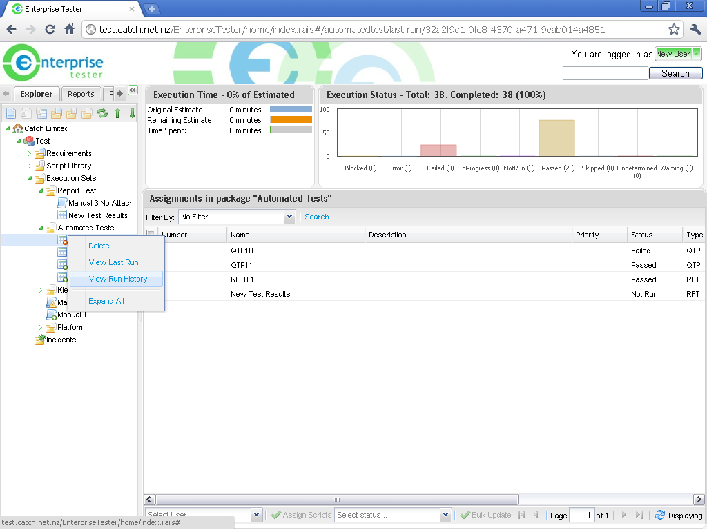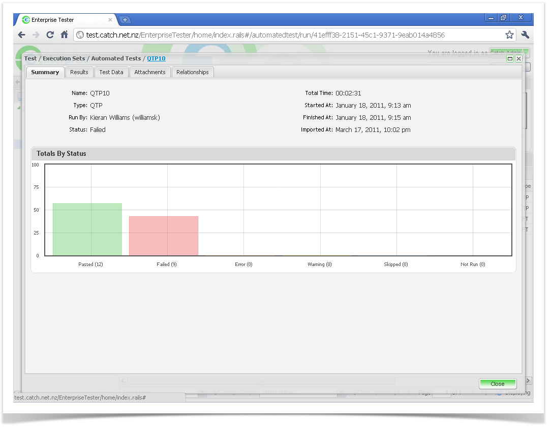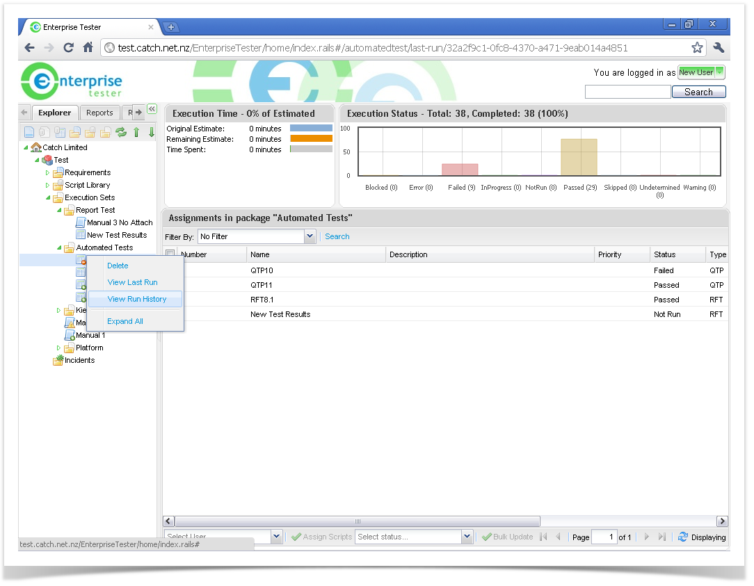 - The Run History screen is displayed for all previous automated test imports - click once on a row to view the relevant test run.