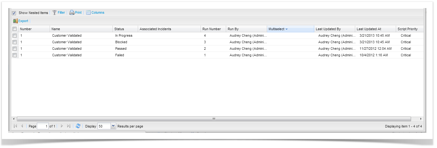 The run history grid offers you the same great features that you see for the Execution Set folder. You can easily configure the columns you wish to see including the version the script used for the run and custom fields.