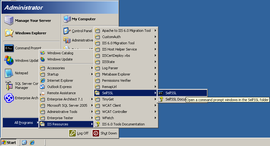 Once installed, launch the "SelfSsl" tool from Start -> All Programs -> IIS Resources -> SelfSSL -> SelfSSL.
