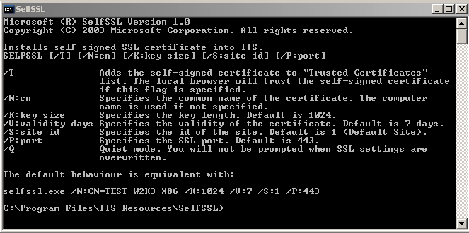 A command prompt window will appear. A self signed certificate can be generated from here. Enterprise Tester is normally associated with the default website, so in most cases a certificate can be generated by issuing the command: