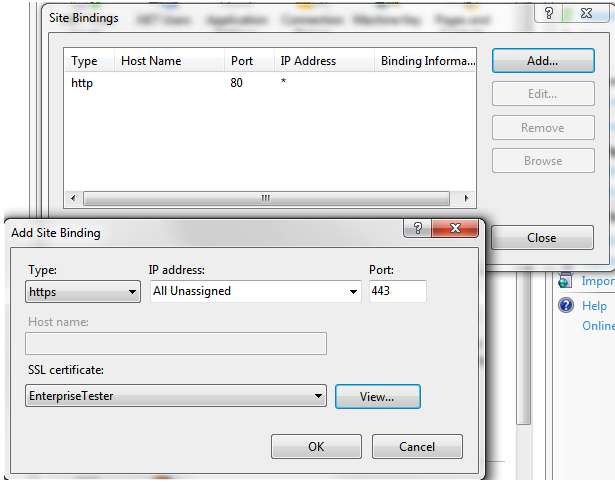 - In the "add" dialog, select "https", then select the self-signed certificate you created earlier.Configuring-Et-For-Ssl V1.0