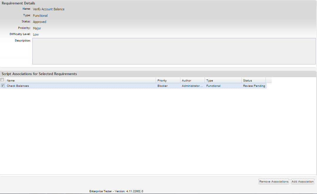 You can remove a number of associations at once by clicking on the check boxes and clicking on Remove Association. In addition, you can add test script to associate to the requirement by clicking on Add Association. You can then select the scripts to associate from the script library.