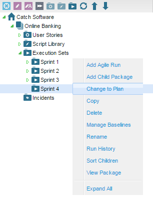 - Right click the test execution package/plan and select Change to Plan/Package as is relevant.