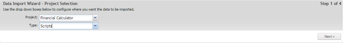 Follow the four step import wizard; starting with configuring where you would like your test scripts to import to. Use the drop down boxes to select the destination project for your data and the type of information being imported e.g. requirements or test scripts. For the example above scripts are chosen.