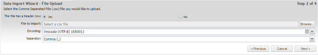 Browse to where your CSV file is stored and specify if the file contains a header row using the radio buttons provided, then click on Next.