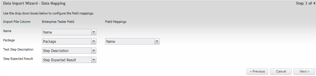 The application will read the CSV file and ask you to map the fields in Enterprise Tester to those in your CSV. Use the drop down boxes to map the fields in your CSV file to the fields in Enterprise Tester. Importing to Enterprise Tester custom fields is also supported.