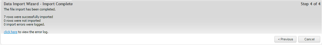 When the import is complete the following status window will appear. If there have been errors, click on the click here to view the error log link for information on why the export failed. If the export was successful, click Cancel.