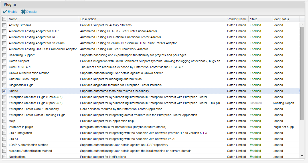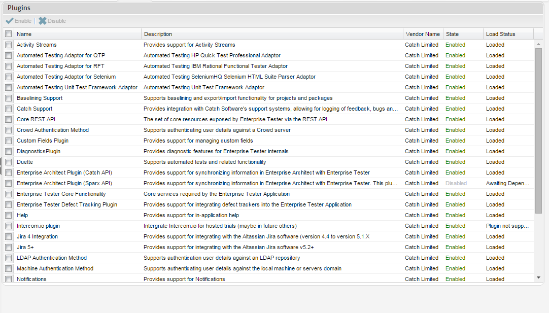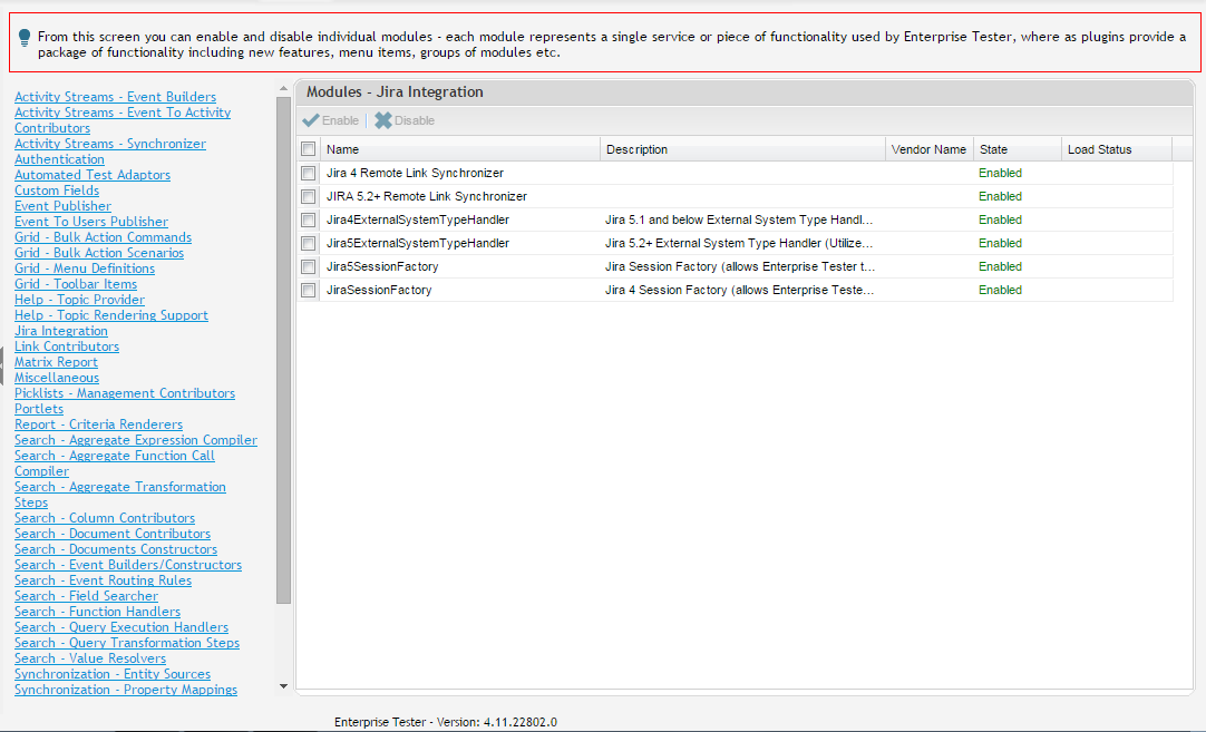 The modules section allows system administrators to enable and disable individual modules - each module represents a single service or piece of functionality used by Enterprise Tester, whereas plugins provide a package of functionality including new features, menu items, groups of modules etc.