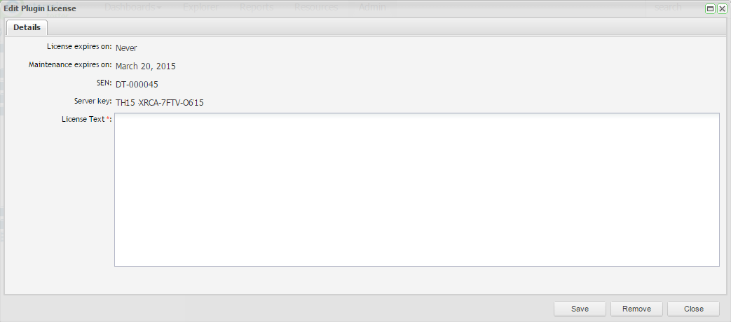 Here you can view the plugin license details including the Maintenance Expiry Date, the Service Entitlement Number (SEN) and the Server Key. You can also apply a new license text here when upgrading or renewing your license.