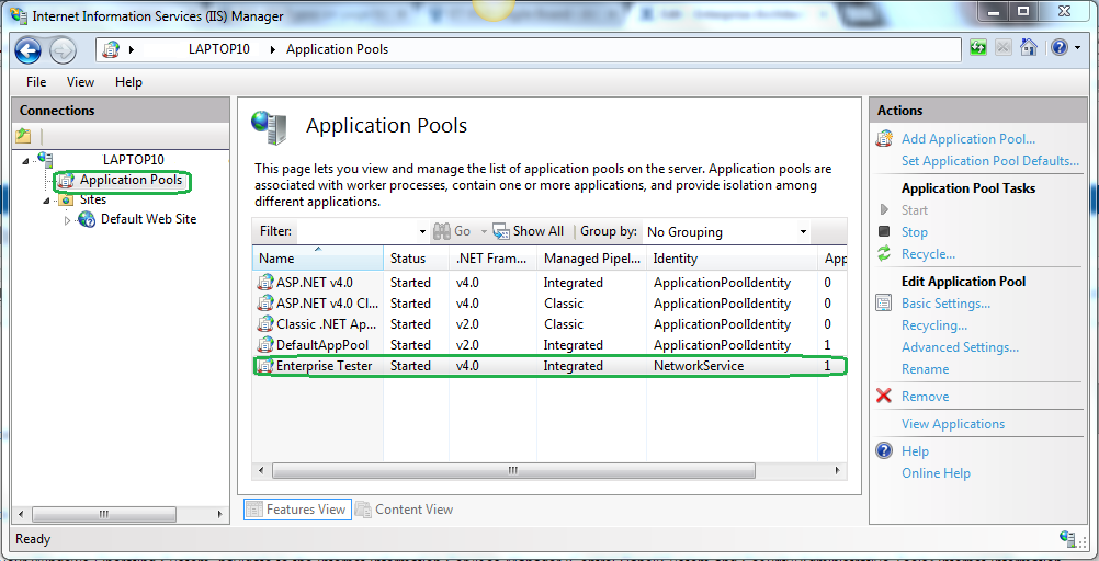 3. Click on Application Pools.  The Application Pools screen will open in the main area and you will be able to see the application pool configured for Enterprise Tester.  You should see a column listing the identity.