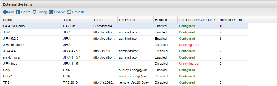 From the External Systems screen, you can set up your EA connection. All connections that have been previously configured to other EA repositories or other external systems will be listed here.