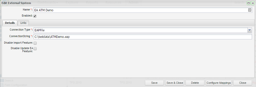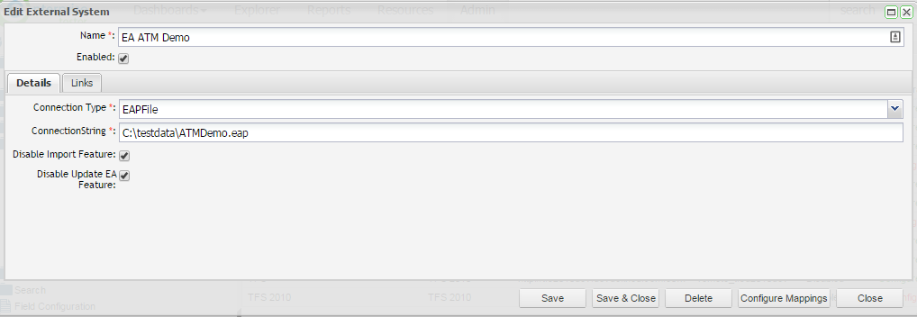 By configuring your field mappings at the connection level you can avoid additional mapping at the project level for each project and link type (requirements and use cases). Note that you will still need to create the project links for each project but you can skip the field mappings step for each project as this will be configured automatically. From the Edit External System screen for your EA connection, click on the Configure Mappings button in the bottom right corner.