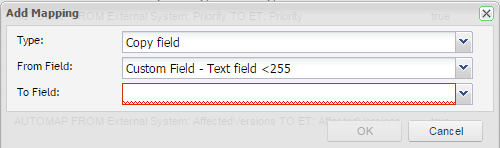 Automap Field | Automap Field mapping will automatically map all matching field values in ET and JIRA so that it is not necessary to do this manually. In addition when synchronizing in the JIRA to ET direction, new field values detected on synchronize from your external system (JIRA) will be added to the ET field value picklist if they don't already exist. Using this type of field mapping eliminates duplicate field management in JIRA and in ET. It will also allow incident synchronization to complete even when map values already exist. This type of mapping is useful for fields like Versions and Components which tend to continually grow. This type of mapping should be used when your picklist values in ET and JIRA are the same. Supported field types include, Combo box (select lists), multiselect list, radio button groups and checkbox groups. *Note: that this feature does not synchronize the picklists between JIRA and ET but it does add values to the ET picklists when new values are detected on incidents during synchronization. |