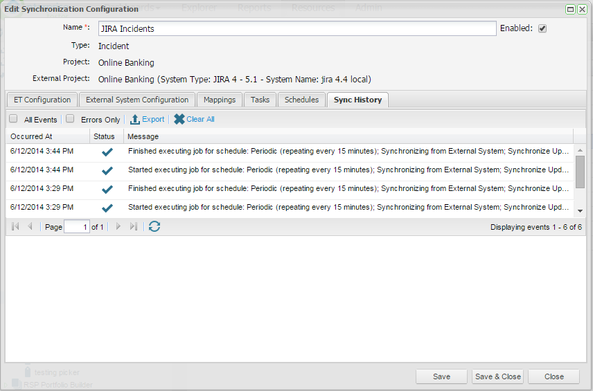 You can view the synchronization history from both the synchronization configuration screen and the individual synchronized entities. From the configuration screen you can view all synchronization events, select to only view errors, export the synchronization events to a .CSV file or clear the history.