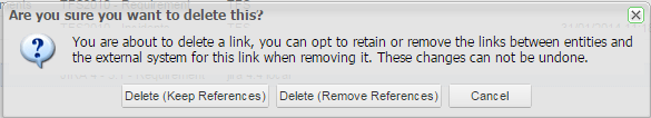 Deleting project links will stop the synchronization between Enterprise Tester and your external system. When deleting the link you will have the option to delete the link and remove all external link references or to retain these references.