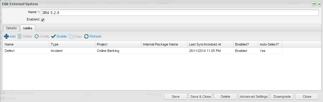 Once the JIRA connection has been created (see Configuring Enterprise Tester for JIRA 5.2 and Above), you can begin associating projects in JIRA with projects in Enterprise Tester. Project links can be created and managed either from the Resources tab on your tree view navigator or on the External System Links tab.