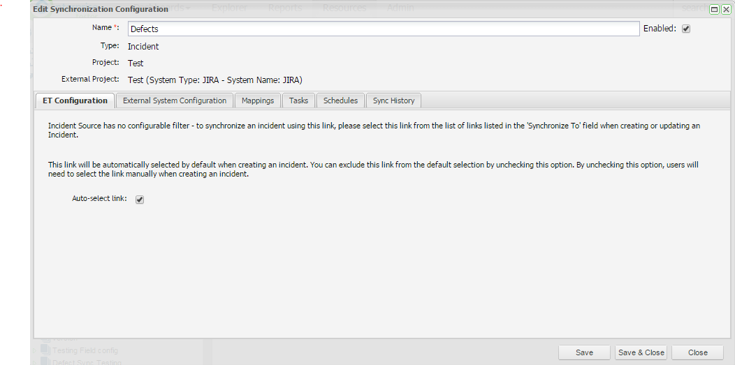 The only configuration option available incident synchronization links is the ability to select the Auto-select Link feature. When selected, this feature will automatically select this project link when creating an incident for the project. There are no other configuration options because Enterprise Tester will synchronize all incidents created in ET for this project with the JIRA project configured. If you have more than one JIRA project configured to synchronize with this project, you can select which project you wish to synchronize with on the incident screen. You can also choose to synchronize ET incidents with more than one JIRA project provided that you have set up multiple project links.