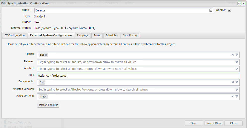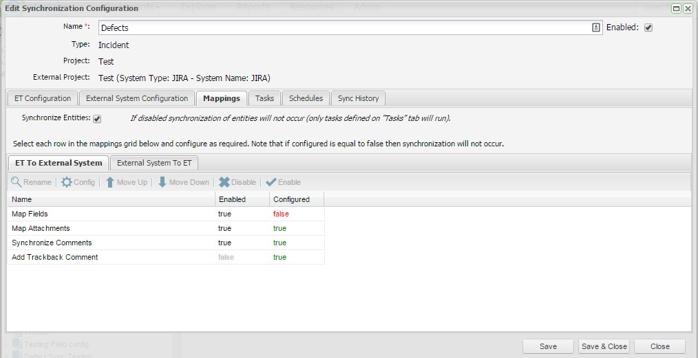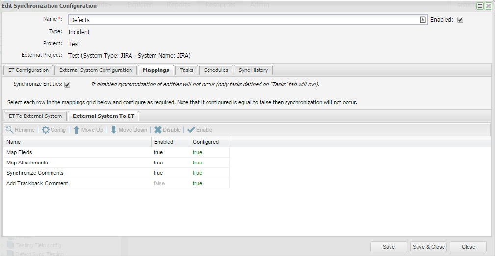 The next step is to configure JIRA to Enterprise Tester field mappings. On the External System to ET tab, there are also four activities that are set to run on Synchronization of an incident: