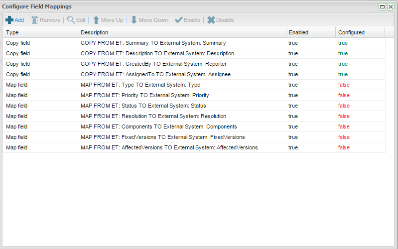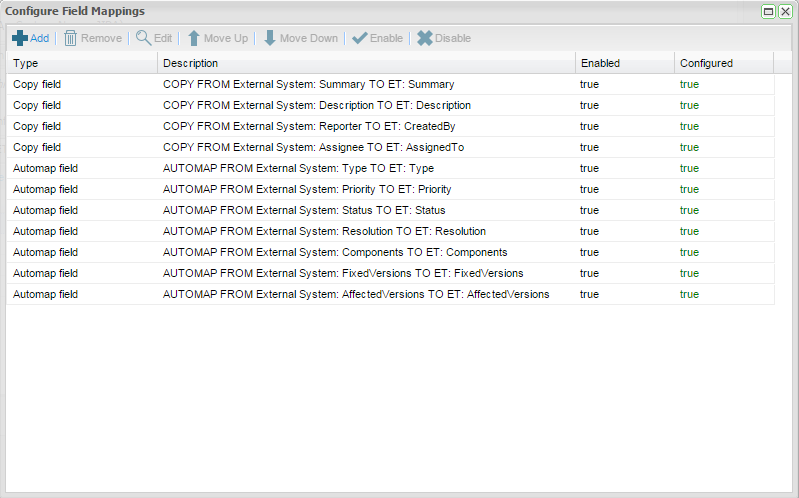 The Configure Field Mappings screen will appear and a number of JIRA inbuilt fields have pre-set mapping to ET inbuilt fields. These are configured as either Copy Field or Automap field type mappings.