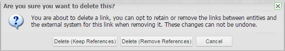 Deleting project links will stop the synchronization between Enterprise Tester and your external system. When deleting the link you will have the option to delete the link and remove all external link references or to retain these references. These include the trackback comments and the defect issue link placed in Enterprise Tester. Note that if you chose to delete the references. This will only affect Enterprise Tester. References to Enterprise Tester in your external system cannot be removed, but all references in Enterprise Tester to your external system will be removed.