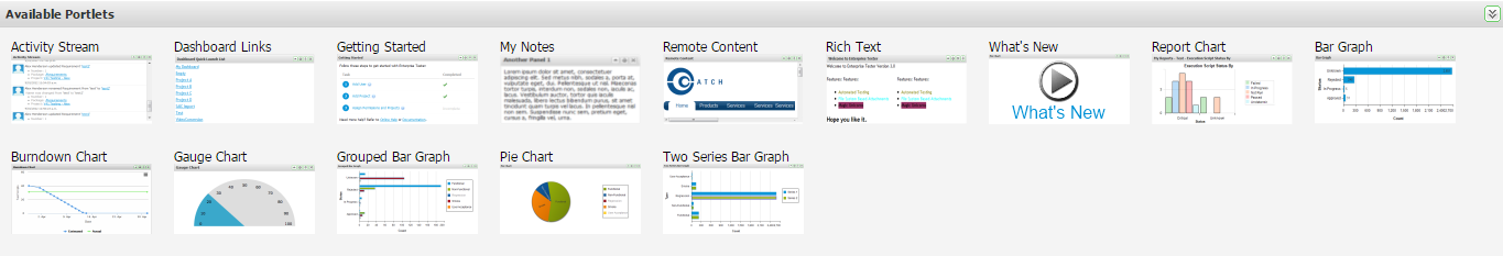 New dashboards are blank and ready for your to customize using the available portlets. Portlets can be dropped onto the dashboard and then moved around as required.