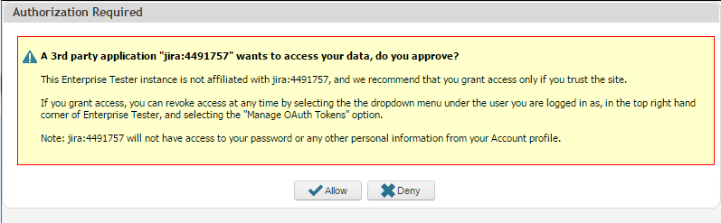 If you are currently logged into Enterprise Tester the authorization screen will appear. If you are not logged into Enterprise Tester you will need to log in first, then the authorization screen will appear. - Clicking "Allow" or "Deny" here will close the window and refresh the gadget - if you clicked "Deny" an error will be displayed in Confluence gadget indicating access has been denied, if you clicked "Allow" you should see the gadget in Confluence refresh to display the correct content.