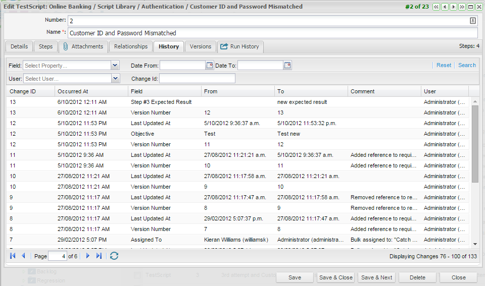 - Select the History tab of the test script when you have the test script open for editing - the history of changes will be displayed.