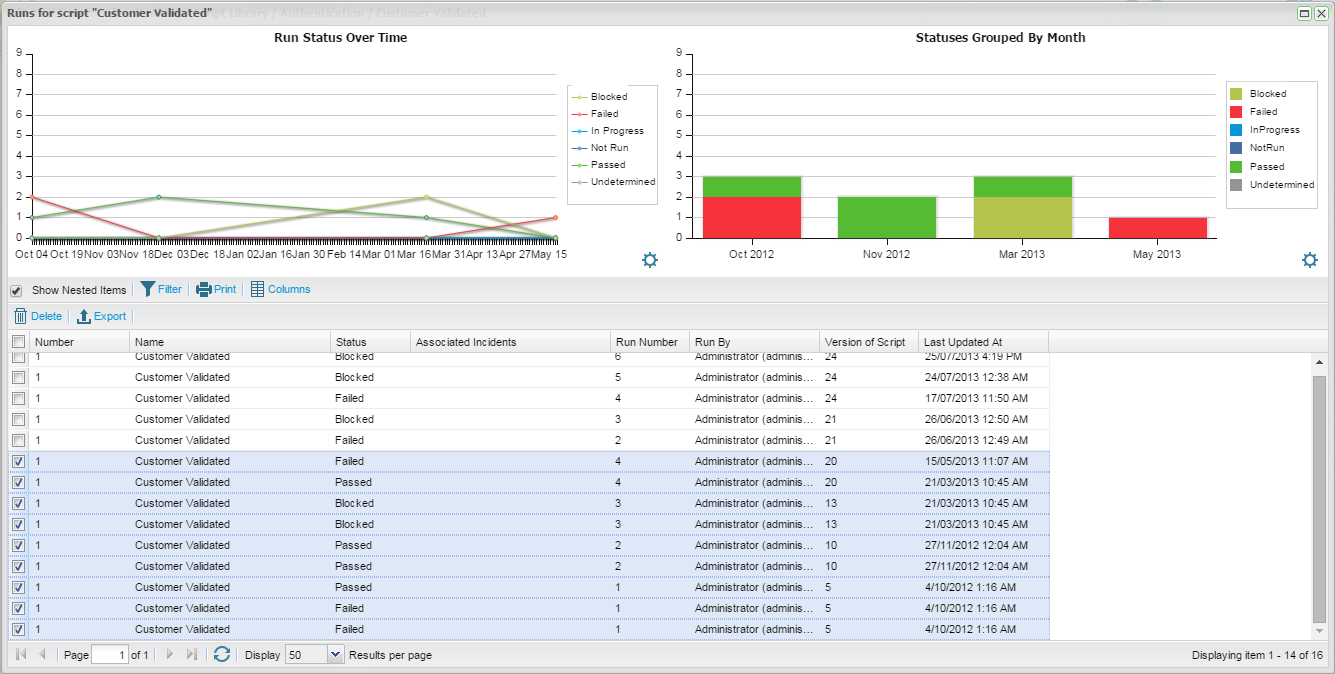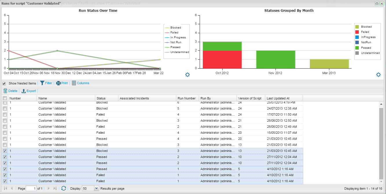 Two charting widgets are provided as standard, the Status Over Time widget and the Statuses Group By Widget. The type of widgets to display are not configurable. From the Run History screen for script assignment. The Status Grouped By widget is configurable and you change chose a date or field parameter to group.