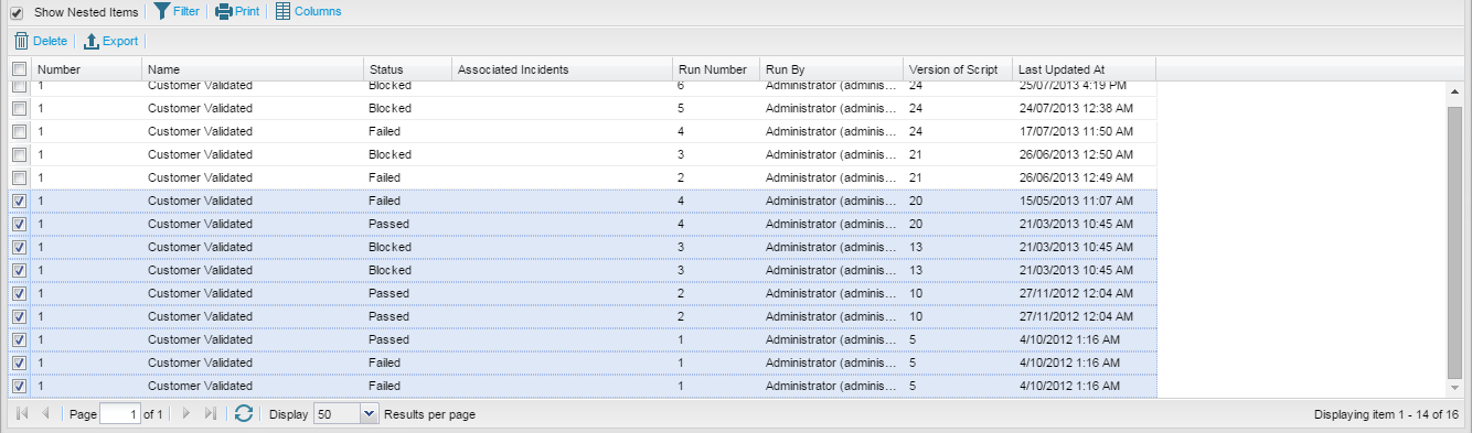 The details displayed on the Run History grid are configurable. You can click Columns button on the toolbar to select the inbuilt fields or the custom field to display in the grid.  You can filter the runs in view by using Search or TQL. Click on the Filter button on the toolbar to access the Search functions.