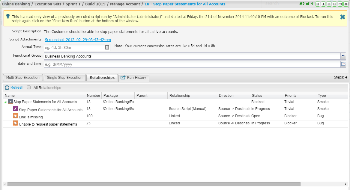 Associated requirements, scripts, script runs, automated tests, automated test runs and incident relationships are displayed.