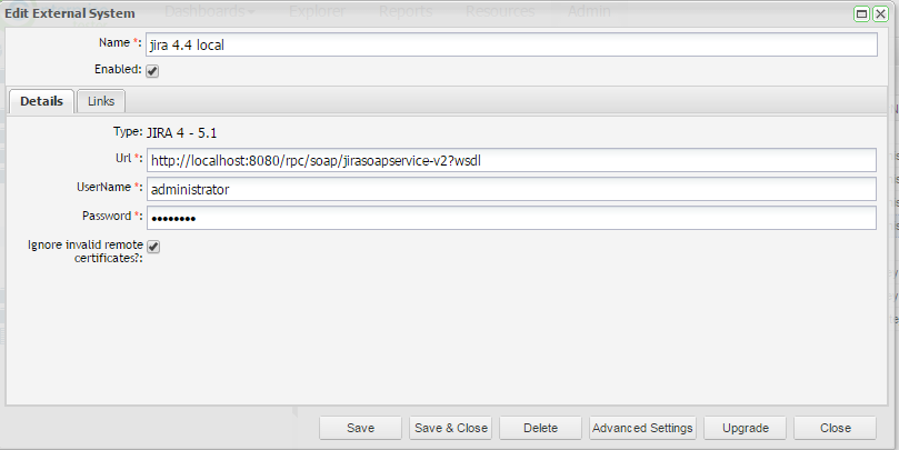| URL | Enter the URL path for the external system. The URL should take the following forms: JIRA: http://URL/rpc/soap/jirasoapservice-v2?wsdl e.g. http://localhost:8080/rpc/soap/jirasoapservice-v2?wsdl TFS: http://<ServerURL>/<Project Collection> |