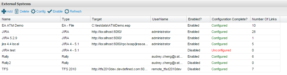 - From the External Systems summary screen, you can view all existing connections and view their enabled and configuration status. Click on Add from the toolbar and add a name for your external system connection and select a connection type: Enterprise Architect, JIRA ( 4 - 5.1), JIRA, Rally or TFS