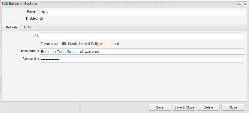 | URL | Enter the URL path for the external system. This can be left blank is you are working with a non-trial hosted instance of Rally. If you are using a trial hosted version of Rally. The URL is: |
